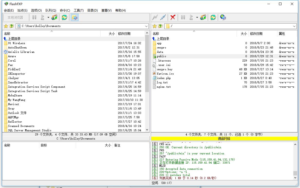 链接成功后如下图,左边 为你本地电脑资源,后边 为远程服务器站点文件资源。 可以使用拖拽或右键等方式传送文件到站点服务器。